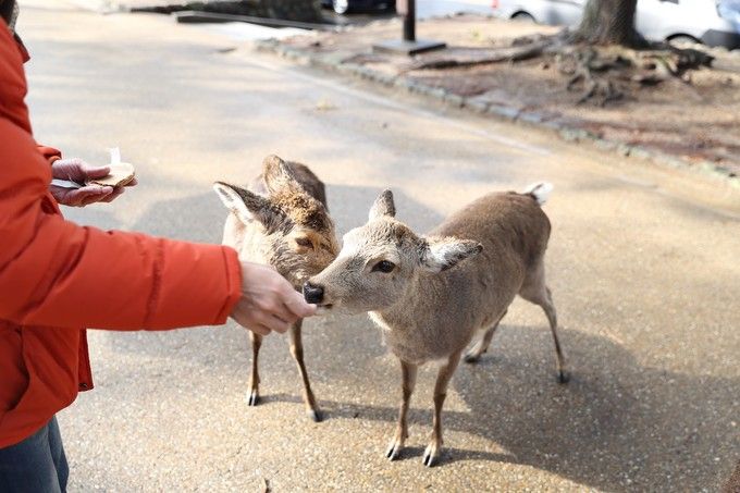 特别需要提醒大家注意的是,奈良的鹿特别喜欢吃,给它什么它都吃,因此除了鹿仙贝以外,一定不要随便喂别的食物,因为人吃的食物中所含的盐、糖与油,对于鹿的身体都会造成负担。另外,大家手里拿的纸、塑料袋也尽量收好,一个不注意被鹿抢走,它们也是会吃的,而这些东西有可能会威胁到它们的生命。
