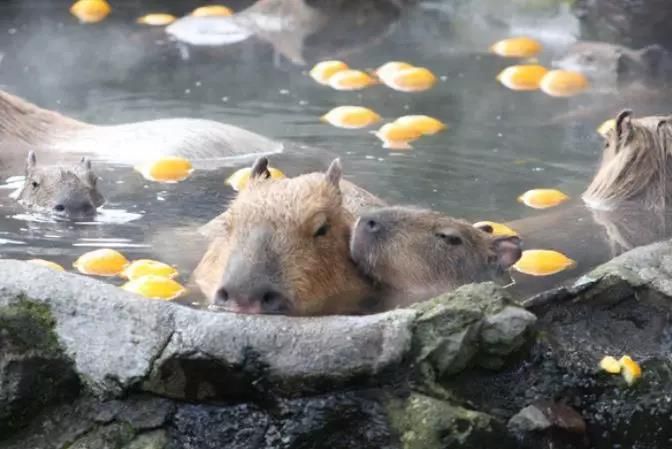 冬至这天,日本那须町的一家动物园为了帮水豚保暖御寒,专门准备了一个露天“柚子温泉浴”。