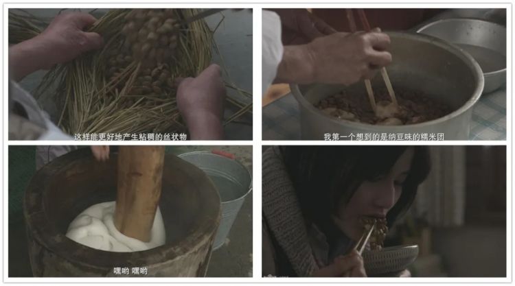 在小森林里,桥本酱用稻草将大豆包裹着自然发酵制作纳豆的方法十分复古,手工在桶里反复敲打出的糯米团更是把“仪式感”推向顶峰,而点睛之笔就是用来调味的砂糖酱油。