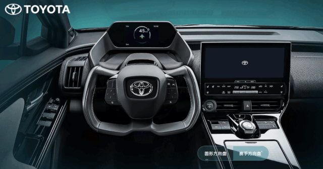 在早前的宣传图上,丰田给bZ4X装上了像飞机操作杆一样的异形方向盘,同时配备了一套名为One Motion Grip的线控转向技术。这套系统可以做到无需换手打方向即可完成转向“打死”的操作,理论上比特斯拉Model S的Yoke方向盘更硬核。