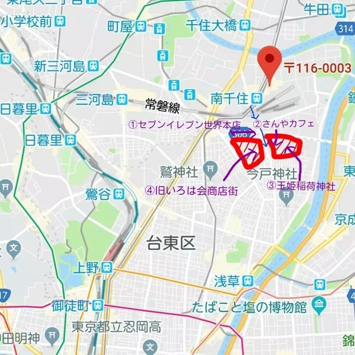上野和浅草是东京有名的人文观光地,在这里汇集了日本主要的博物馆,艺术馆和象征性建筑。三大ドヤ街之一的山谷,就在它们的不远处。(地图中红色圈出的区域)