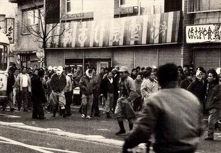 60年代,由于当时东京奥运会引发的流浪者清除运动,山谷地区逐渐产生了带有政治诉求的骚动。同警察的接连冲突,也让人们形成了山谷地区治安混乱的印象。