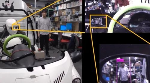 机器人的眼睛可以在后视镜追踪物体,就跟人自己看后视镜差不多: