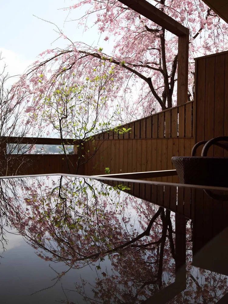 拥有400年悠久历史的“琴平花坛”,是一家坐落于琴平山山麓的老字号旅馆,毗邻著名的金刀比罗宫。翻阅昔日的宿帐,能发现众多皇室以及森鸥外、与谢野晶子等文人墨客曾在此留宿的记载,历史底蕴深厚。旅馆内的广阔日式庭园,点缀着三栋风雅的数寄屋造独立别馆,成为象征性的存在。环绕庭园而建的三大住宿区域,其中“富士见台”是理想之选。这里和洋式特别客房将庭园美景巧妙融入设计,房内的露台上设有桧木露天浴池,可边泡汤,边欣赏庭院的四季变换。尤其在春日,屋旁的枝垂樱悄然绽放,粉色花朵轻垂入景,营造出宛如梦境般的赏樱体验。不妨在暖汤与樱花相伴下,度过一段悠然自得的疗愈时光吧。