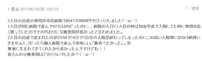 我在市民医院生了第二个孩子,一共花了约47万9000日元,吓了我一跳。(´・ω・`) 第一个孩子也是在这家医院生的,当时只花了不到42万日元。医院的人说,当时是因为先兆早产,入院的时候收取了比较高的费用,所以分娩费用就比较低。第二个孩子出生的时候是23:50,过了10分钟,就算了住院一天,所以我无法接受这么高的入院费。早知道还不如去私人医院生,还能吃到好吃的饭菜呢。(笑)不过能顺利生下来真是太好了。大家的分娩费用都是多少呢?(´・ω・`)